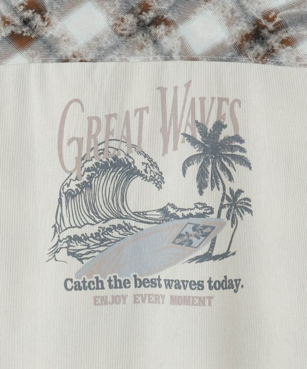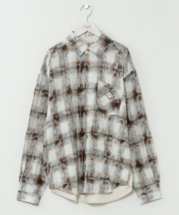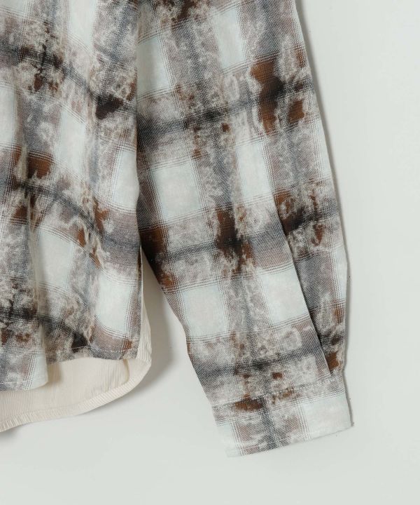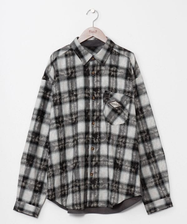 加工感のある薄手のチェック生地と細畝のコーデュロイを切り替えたメンズシャツ。背中のプリントが印象的で、一枚でも羽織りとしても活躍します。軽やかな素材感で、初春から春にかけて長く着られるデザイン。Tシャツやタンクトップとの重ね着スタイルにもおすすめです。