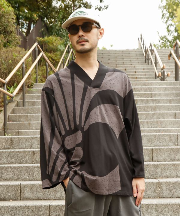 肌ざわりの良いコットン素材を使用したメンズトップス。束ね熨斗(たばねのし)、扇、宝袋など縁起の良い柄を大胆にあしらい、着る人に福を呼び込むような華やかさがあります。合わせ衿のデザインが和装らしさを演出し、ゆったりとしたシルエットで動きやすさも抜群。日常に取り入れやすい和モダンなトップスです。