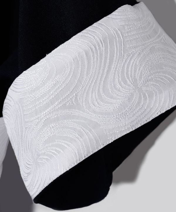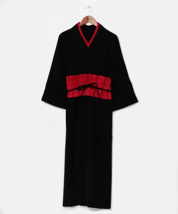 衿元や袖口、帯にジャカード生地を使用した上品なワンピース。一枚で着物のようなスタイリングが完成します。流水をモチーフにした文様が織り込まれ、動くたびに八掛部分の生地がちらりと見える上品な仕立て。帯部分は整えやすい仕様で、ケアも簡単なポリエステル生地のワンピースです。