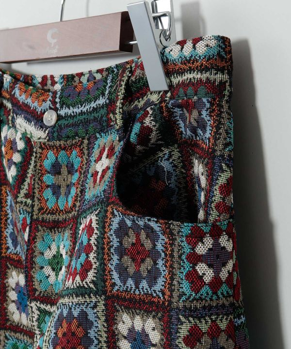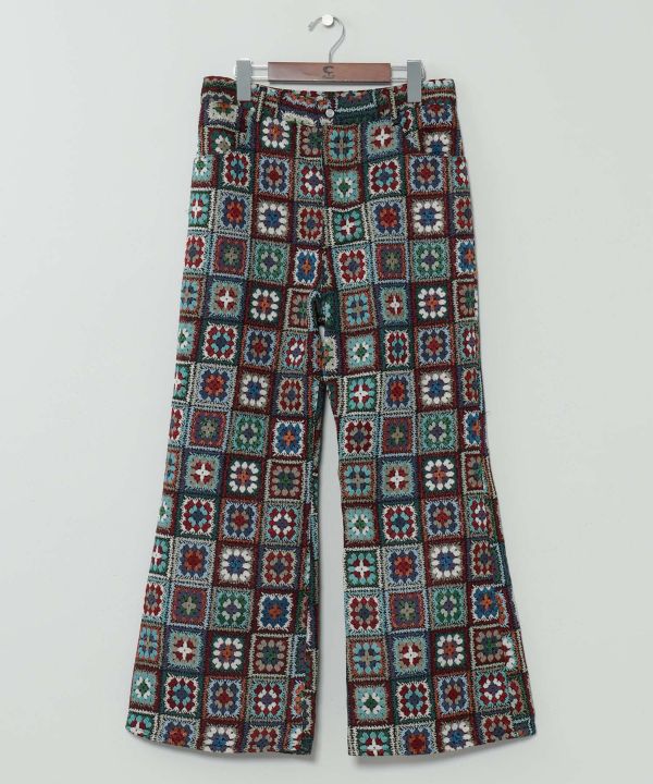 クロシェ風ゴブラン生地を使ったベルボトム型パンツ。ヒッピー感漂うクラシカルなデザインで、脚長効果も抜群。個性派スタイリングに取り入れたい一着。