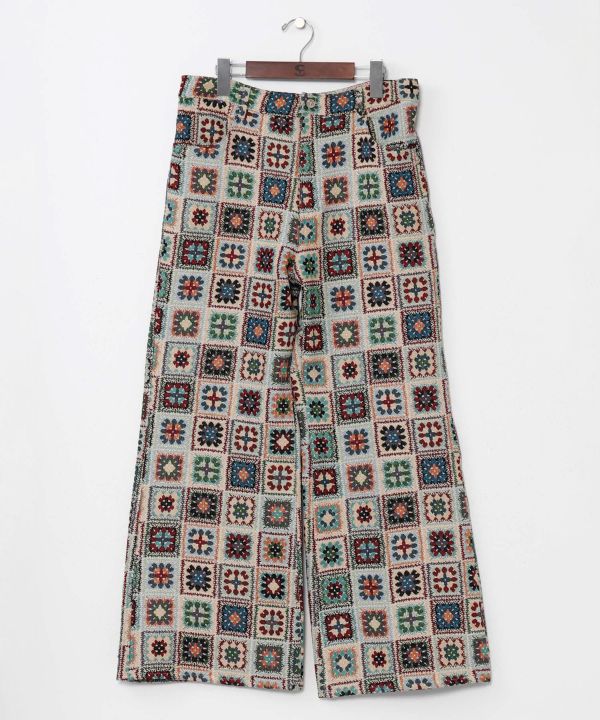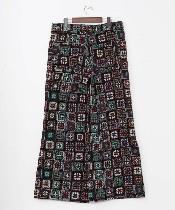 クロシェ風ゴブラン生地のベルボトムパンツ。ヒッピースタイルをイメージし、シルエットが美脚見え。重厚感ある素材ながらも動きやすさも魅力。差がつく1本。