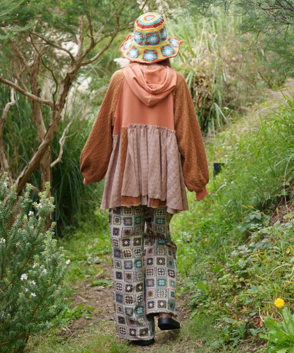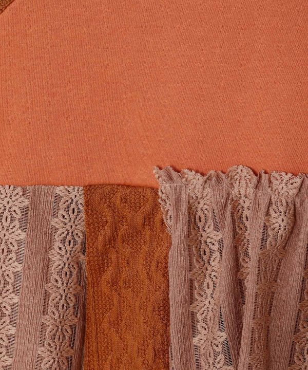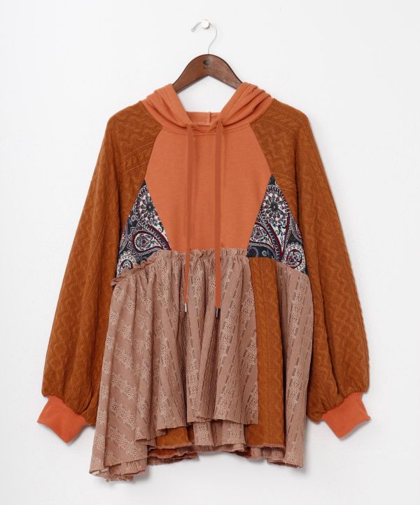フォークロア調の切替デザインが個性的な裏毛トップス。レトロな素材使いとアクセントのテープが魅力。古着ライクな雰囲気で、カジュアルなコーデにもおすすめ。
