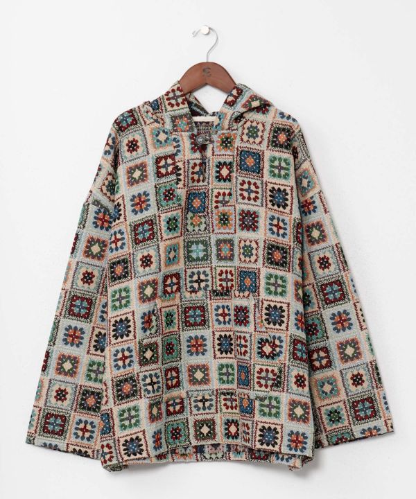 ゴブラン風生地のフード付きメンズトップス。メタルボタンがアクセントのレトロ感漂う一着。ゆったりサイズで羽織りとしても活躍。個性派コーデにぴったり。