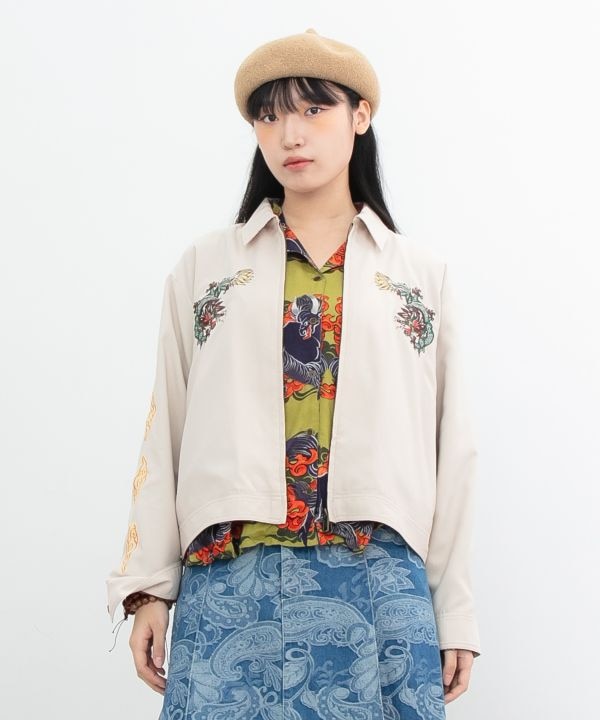 ドラゴンと雲の刺繍が目を惹くスーベニアジャケット。スーベニアジャケットの一種である「ベトジャン」にチベット文化を融合させたデザイン。ダブルジップ仕様で着こなしの幅が広がる万能アウター。