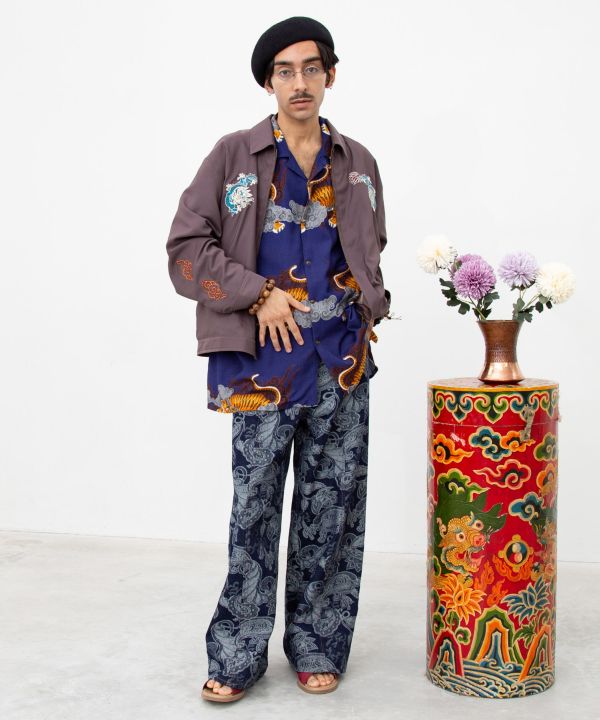 チベット文化を取り入れたメンズスーベニアジャケット。吉祥モチーフの刺繍がアクセント。ダブルジップでスタイリング自在。カジュアルにもモードにも活躍。