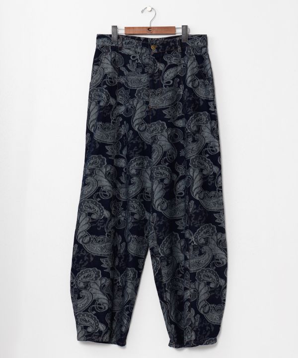 美しいシルエットが魅力のデニムパンツ。手織りの高級カーペット「段通」をイメージした繊細な柄のデザイン。スラックスのようにすっきりと履ける万能シルエットで、柄物との相性も抜群な一本。