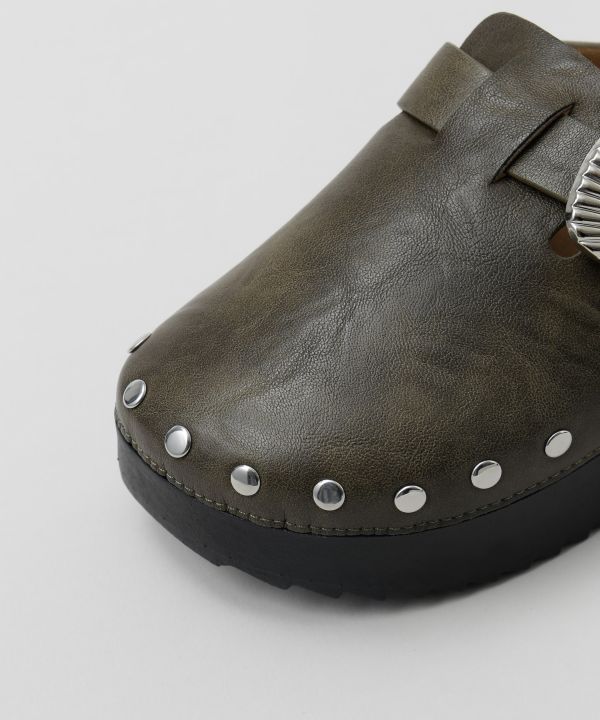 丸型スタッズがアクセントになった厚底サンダル。程よいツヤの合皮素材でヴィンテージライクに仕上げ、季節を問わず使える万能アイテム。足元を引き締める存在感。