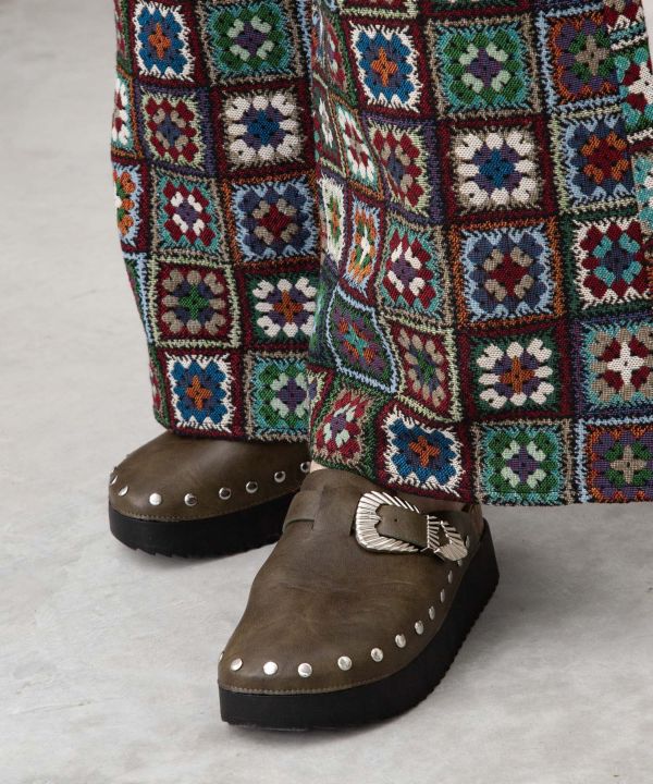 丸型スタッズがアクセントになったサンダル。程よいツヤ感のある合皮素材がヴィンテージな雰囲気を演出。メンズライクなシルエットで、季節問わず履き回せる万能アイテム。