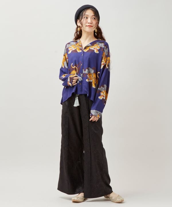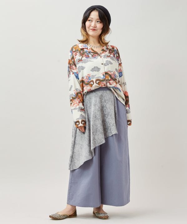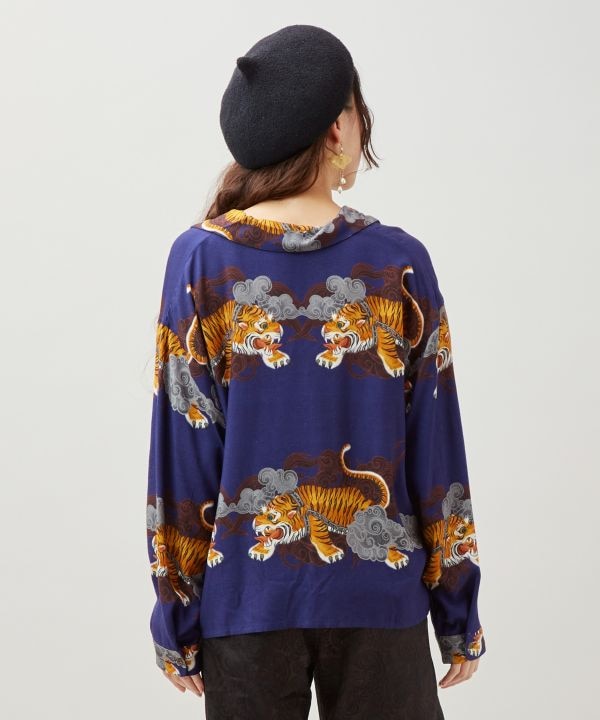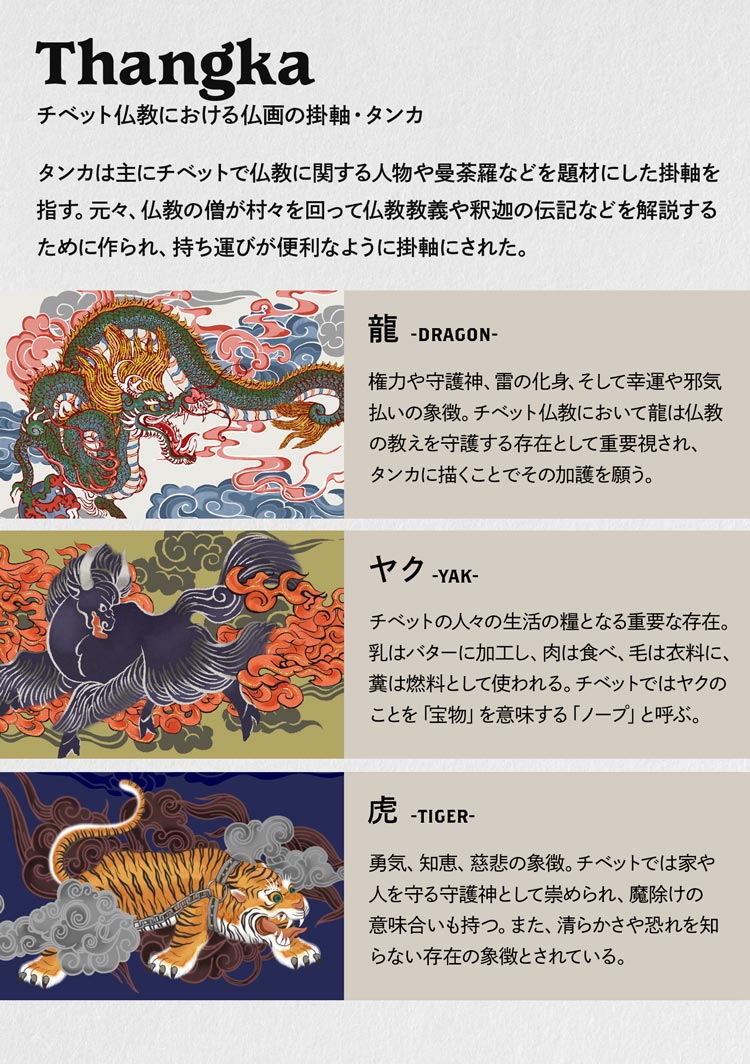 チベット仏教の掛軸「タンカ」を切り抜いたようなボーダー柄が印象的な長袖シャツ。雲の吉祥文様や龍・虎・ヤクのモチーフが調和し、レーヨン素材で肌あたりもやさしい一枚。龍:権力や守護神、雷の化身、幸運や邪気払いの象徴 /虎:勇気、力、智慧、慈悲の象徴 /ヤク:チベットの人々にとって生活の糧となる重要な存在。