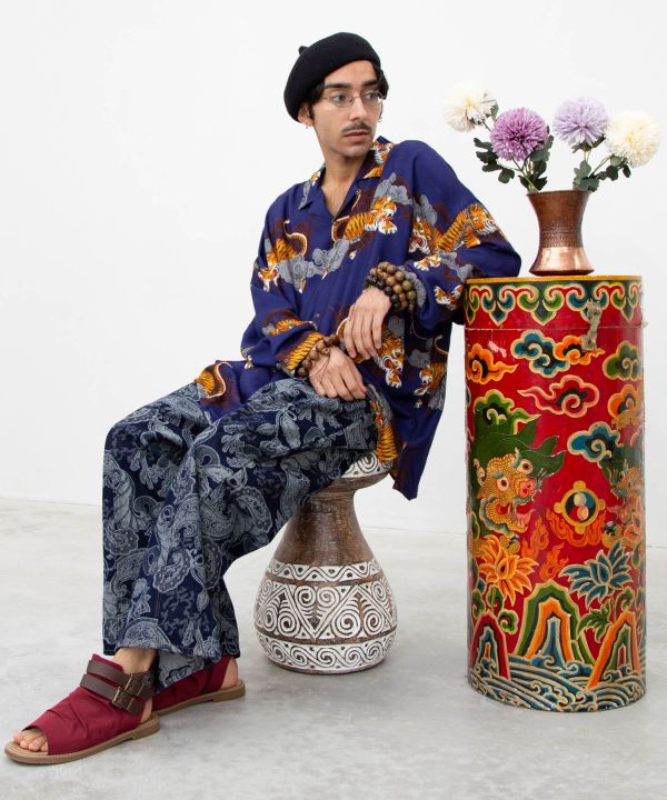 チベット仏教の仏画「タンカ」を切り抜いたようなモチーフをボーダー調に配したシャツ。龍・虎・ヤクなどの象徴的な柄を重ね、レーヨン素材で快適な肌触り。龍:権力や守護神、雷の化身、幸運や邪気払いの象徴 /虎:勇気、力、智慧、慈悲の象徴 /ヤク:チベットの人々にとって生活の糧となる重要な存在。