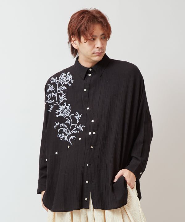 胸に牡丹の刺繍を施したメンズシャツ。ボタンの留め方で印象チェンジ可能。レーヨン麻素材でさらっとした肌触り。