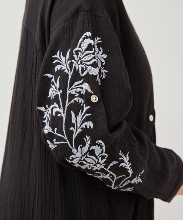 斜めボタンと変形シルエットが特徴の刺繍ワンピース。胸と袖に牡丹刺繍をあしらい、レーヨン麻素材で落ち感のある上品な仕上がり。