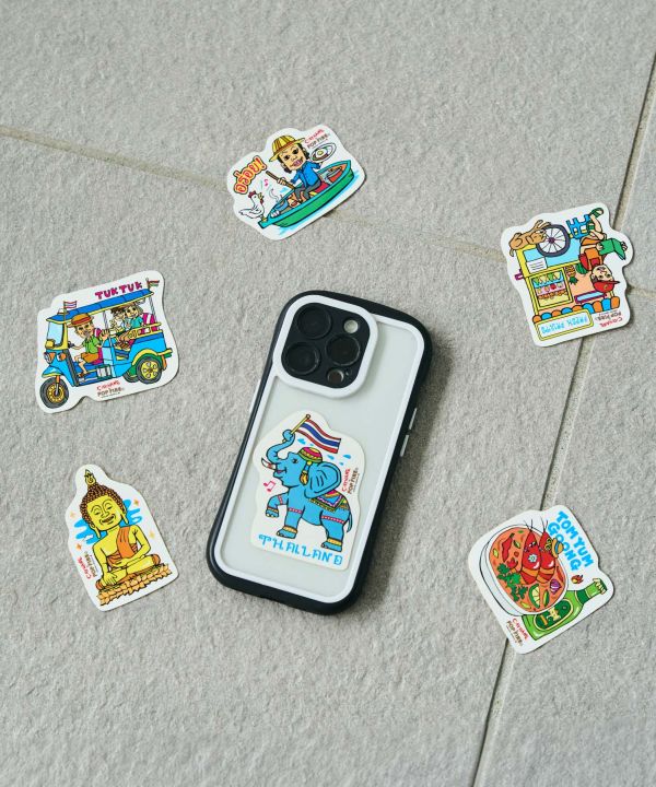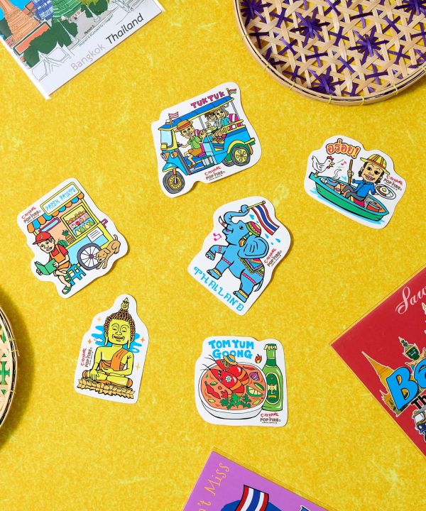 【Amina×POP FIRE】微笑みの国タイをテーマにしたカラフルなステッカー。ユニークでポップなデザインが日常に旅の風を吹き込みます。ノートやスマホ、小物のカスタムにもおすすめのアイテムです。