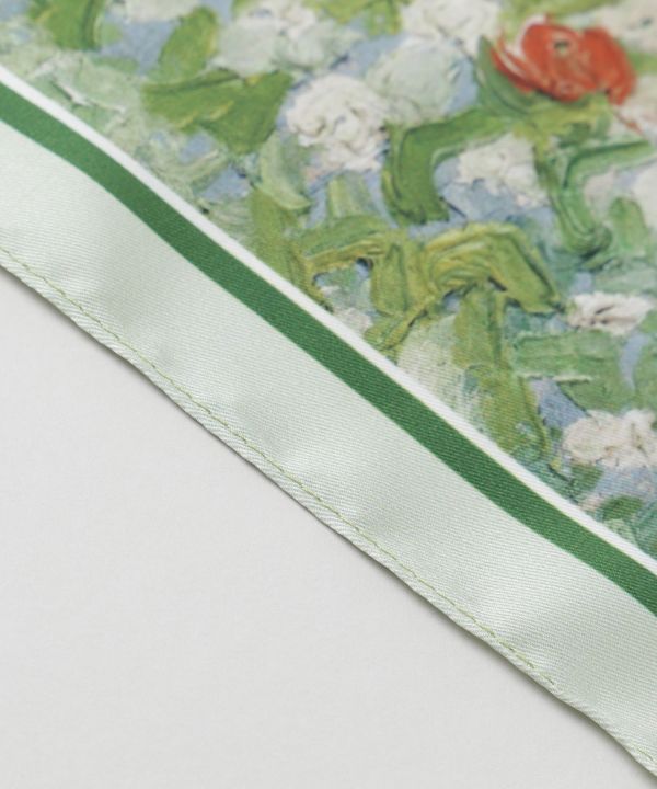 絵画のようなプリントが目を引く三角形型ストール。軽やかな素材で、髪に巻いたり肩にかけたりとアレンジ自在。個性を引き立てるアイキャッチな一枚。