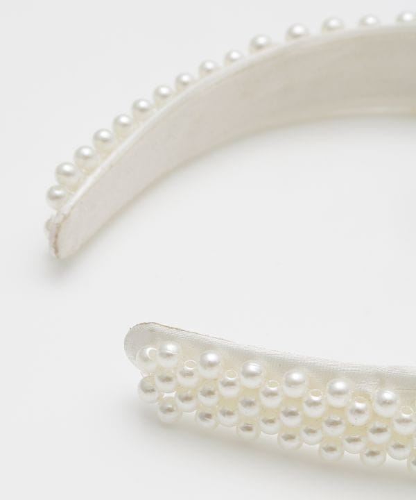 大粒のパールを贅沢に配したカチューシャ。幅広のフォルムがヘアアレンジを華やかに引き立て、アクセサリー感覚で楽しめる一品。シンプルな服に映えるアイキャッチな存在感。