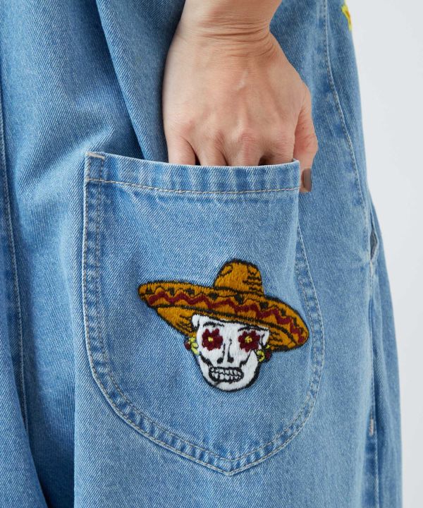 ウエスタンモチーフの刺しゅうが施されたデニムサロペット。ゆったりとしたサイズ感で男女問わず着用可能。