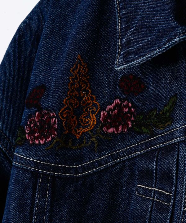 ウエスタンブーツ、カーネーション、カラベラを刺しゅうしたデニムジャケット。ヒッピーカルチャーを感じる切り替えデザイン。
