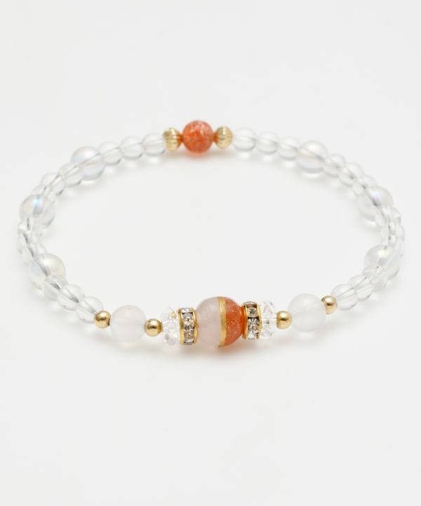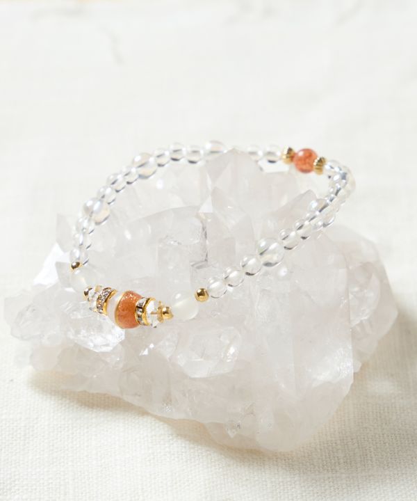 太陽の神・天照大神(あまてらすおおみかみ)と、月の神・月読命(つくよみのみこと)をイメージした数珠ブレスレットです。サンストーンは光を象徴するアマテラスを、レインボームーンストーンは静寂を司るツクヨミを表現。24金相当の金粉を使用した「金継ぎ」をイメージしたデザインが、調和とつながりを感じさせます。