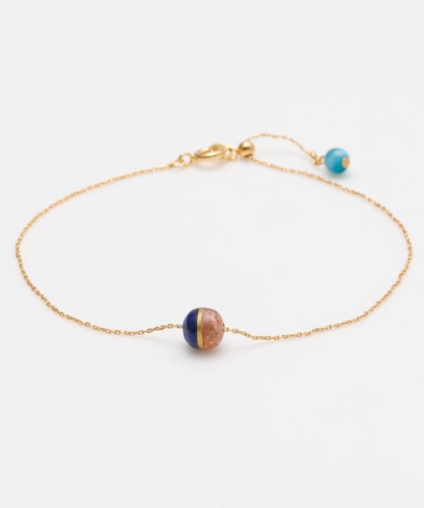 太陽の女神・天照大御神(あまてらすおおみかみ)と、海と嵐の神・須佐之男命(すさのおのみこと)をイメージしたブレスレットです。輝くサンストーンは光と希望を司るアマテラスを、深い青のラピスラズリは勇気と行動力を象徴するスサノオを表現。姉弟の神の絆を思わせる配色に、24金相当の金粉を使用した「金継ぎ」をイメージしたデザインを加え、調和と再生の美しさを表しました。スライドチェーンでサイズ調整が可能です。