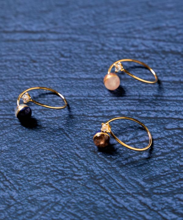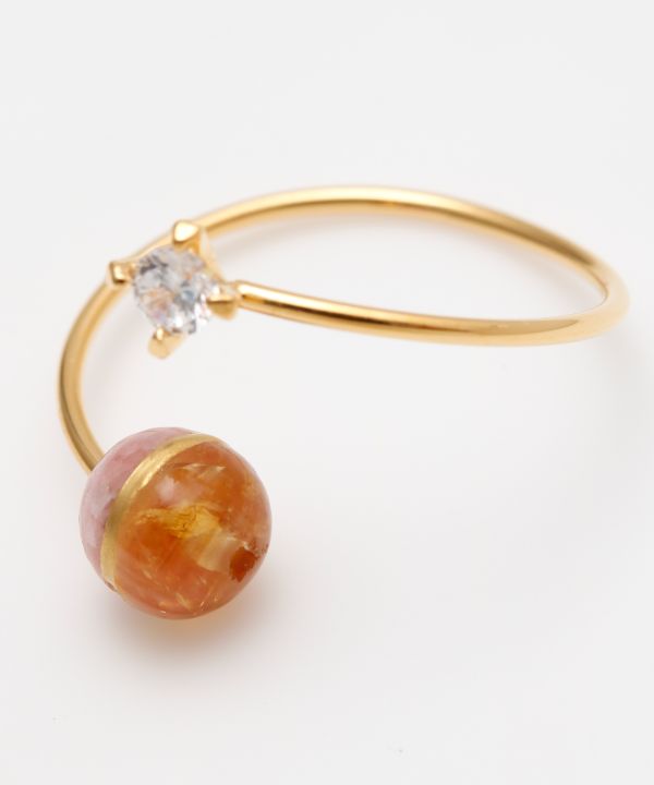 日本神話に登場する夫婦の神、瓊瓊杵尊(ににぎのみこと)と木花咲耶姫(このはなさくやひめ)をイメージしたリングです。黄金色に輝くシトリンは実りと繁栄をもたらすニニギノミコトを、優しいピンクのインカローズは愛と美しさを象徴するコノハナを表現。ふたりの神の結びつきを思わせる配色に、24金相当の金粉を使用した「金継ぎ」をイメージしたデザインを加え、調和と絆の美しさを表しました。幸福と豊かさをそっと導くリングです。
