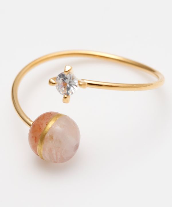 太陽の神・天照大神(あまてらすおおみかみ)と、月の神・月読命(つくよみのみこと)をイメージしたリングです。サンストーンは光を象徴するアマテラスを、レインボームーンストーンは静寂を司るツクヨミを表現。24金相当の金粉を使用した「金継ぎ」をイメージしたデザインが、調和とつながりを感じさせます。