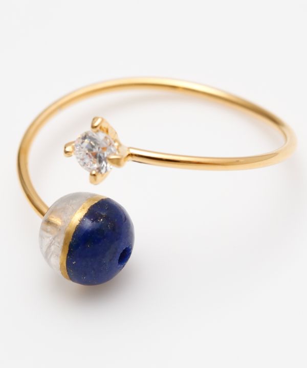 月の神・月読命(つくよみのみこと)と、海と嵐の神・須佐之男命(すさのおのみこと)をイメージしたリングです。穏やかな輝きを放つレインボームーンストーンは静けさと調和を司るツクヨミを、深い青のラピスラズリは力強さと勇気を象徴するスサノオを表現。兄弟神の結びつきを、金継ぎを思わせるデザインで品よく仕上げました。(「金継ぎ」をイメージした意匠部分には、24金相当の金粉を使用しております)