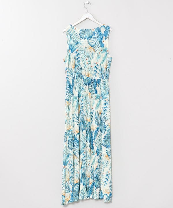 トップスとワンピースのセットアイテム。ハワイをイメージしたボタニカル柄が華やかで、涼しげなカットソー素材が快適な着心地を実現。トップスとワンピースは別々にも着用でき、ワンピースはプリーツ加工でスタイルアップ効果も期待できます。