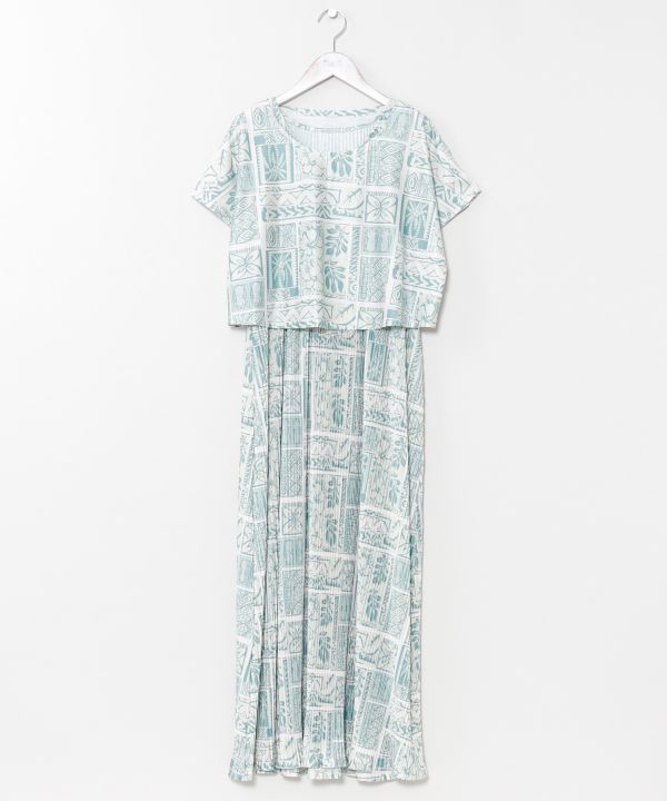 トップスとワンピースのセットアイテム。ハワイをイメージしたボタニカル柄が華やかで、涼しげなカットソー素材が快適な着心地を実現。トップスとワンピースは別々にも着用でき、ワンピースはプリーツ加工でスタイルアップ効果も期待できます。
