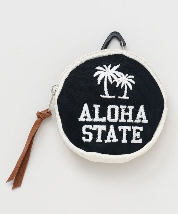 カラビナ付きでバッグやベルトループに取り付け可能なラウンドポーチ。鍵やリップなど小物の収納に便利。ハワイの陽気な色使いと遊び心のあるデザインがポイント。