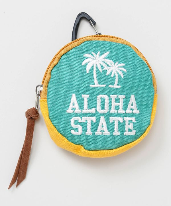 カラビナ付きでバッグやベルトループに取り付け可能なラウンドポーチ。鍵やリップなど小物の収納に便利。ハワイの陽気な色使いと遊び心のあるデザインがポイント。