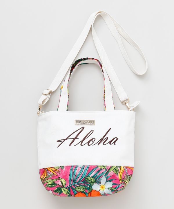 ハワイ直輸入の鮮やかな生地を使用した2WAYトート。ショルダーベルト付きで使い分け可能。中には仕切りもあり整理しやすく、日常から旅行まで活躍。リゾート気分を運ぶ華やかなデザイン。