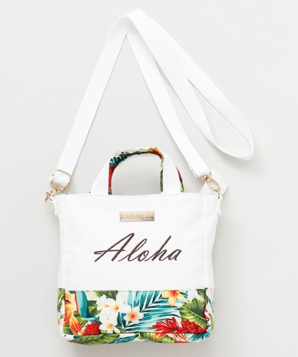 ハワイから輸入したカラフルな生地を使用した2WAYミニトート。ショルダーベルト付きでトートにもショルダーにもアレンジ可能。中には仕切りがあり使いやすい設計。コンパクトながら収納力があり、旅先にもぴったりなリゾートデザイン。