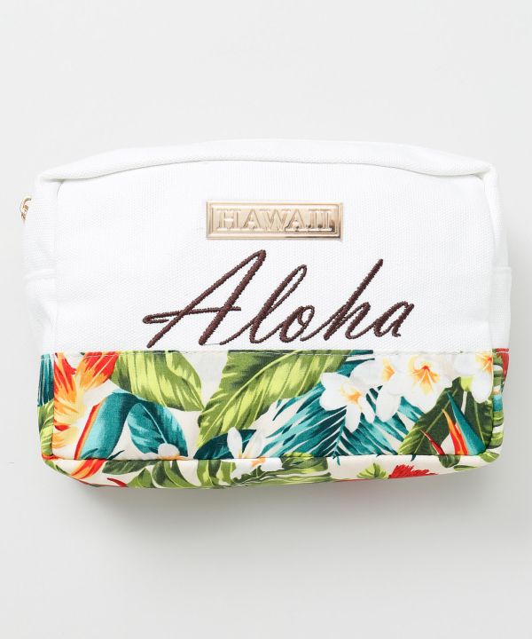 ハワイ直輸入の生地を使った鮮やかなポーチ。仕切り付きで整理しやすく、コスメや小物入れに最適。ナチュラルで温かみのあるデザインが、持つだけでハワイの空気を感じさせます。