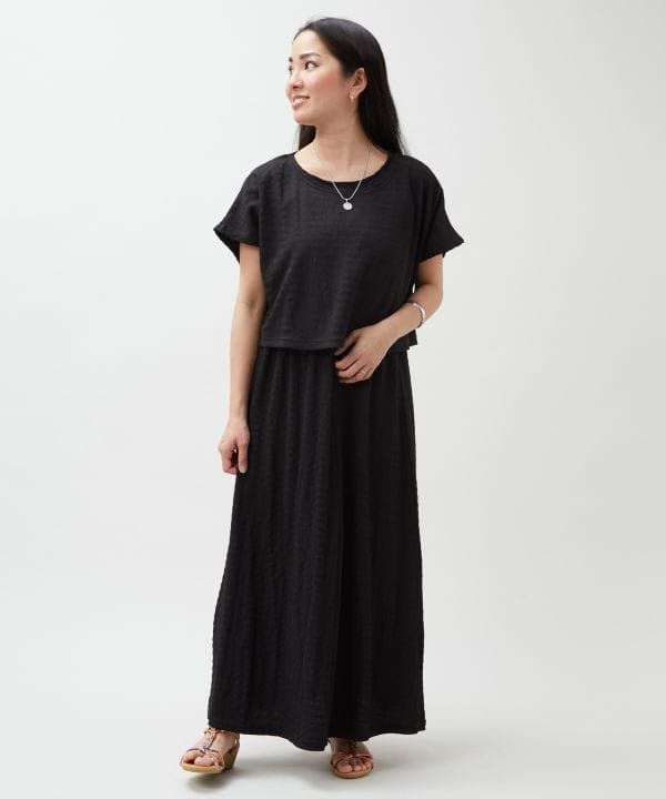 皺になりにくくストレッチ性のある柔らかなカットソー素材を使用したセットアイテム。トップスとワンピースを別々にも着用でき、着こなしの幅が広がります。リラックス感のある着心地が魅力。