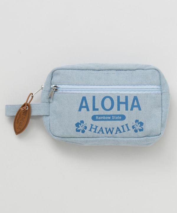 デニム素材の持ち手付きポーチ。旅行やおでかけに便利なサイズ感で、コスメや小物の収納にも活躍。ナチュラルな風合いとシンプルなデザインが魅力。