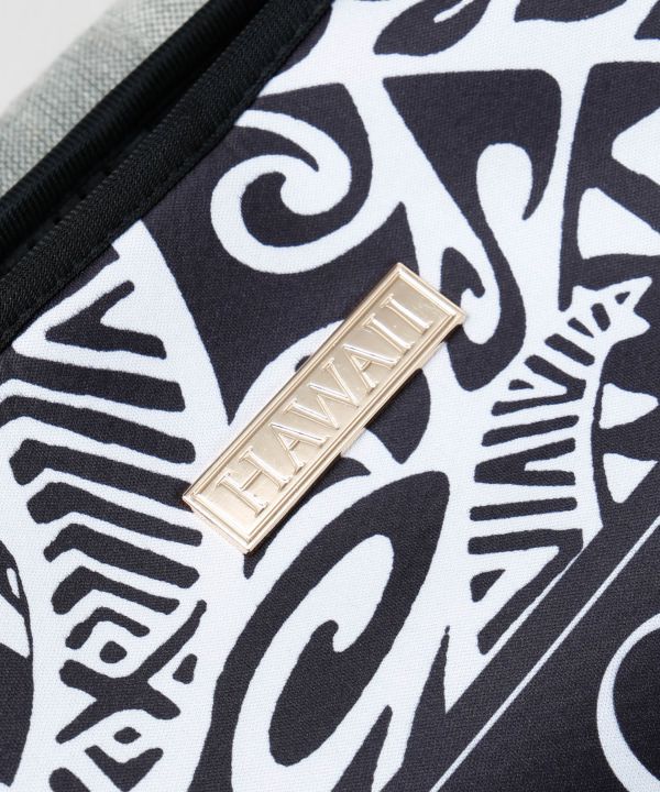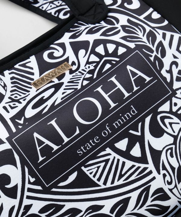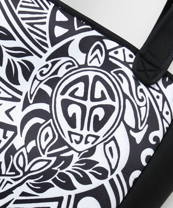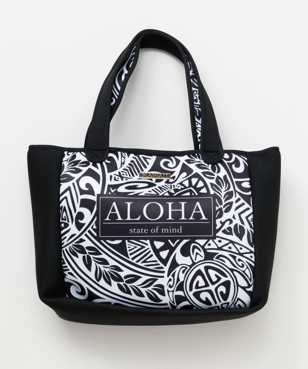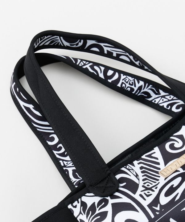 ウェットスーツ素材を使用したハワイアンプリントのトートバッグ。軽量で丈夫な作りが魅力。マリンスポーツや旅行、日常使いにもぴったりの万能アイテム。ハワイの海を感じる爽やかなデザイン。