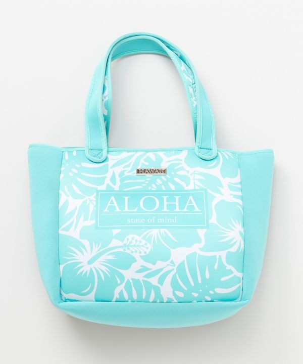 ウェットスーツ素材を使用したハワイアンプリントのトートバッグ。軽量で丈夫な作りが魅力。マリンスポーツや旅行、日常使いにもぴったりの万能アイテム。ハワイの海を感じる爽やかなデザイン。
