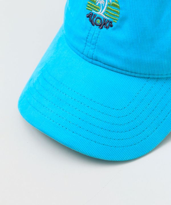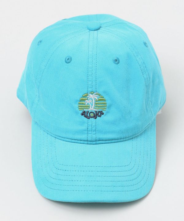 コーデュロイ素材にALOHAとサンセットの刺しゅうが映えるキャップ。カラフルな配色が目を引き、ハワイの陽気な雰囲気を感じさせます。サイズ調整可能で、季節を問わず使えるカジュアルスタイルにおすすめ。