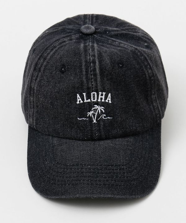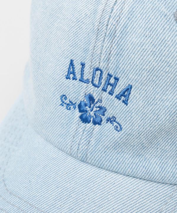 デニム素材にALOHAとハイビスカス、パームツリーの刺しゅうを施したキャップ。カジュアルながらもハワイの自然を感じるデザインが魅力。サイズ調整可能で、デイリーコーデにリゾート感をプラスします。