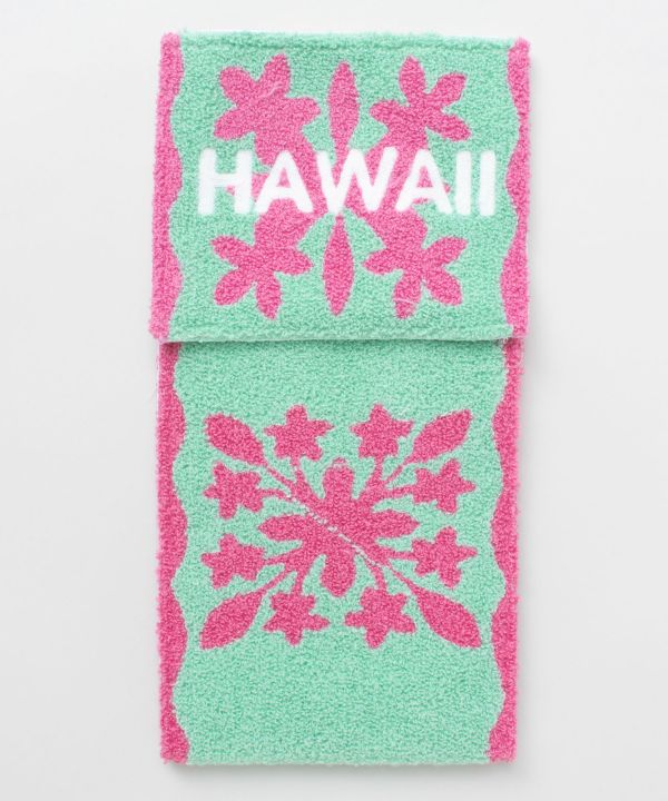 ハワイアンキルトモチーフが描かれたロールペーパーホルダー。爽やかなカラーリングがトイレ空間を明るく彩ります。立体的な刺しゅうと温かみのある素材感が魅力のハワイアンデザインです。