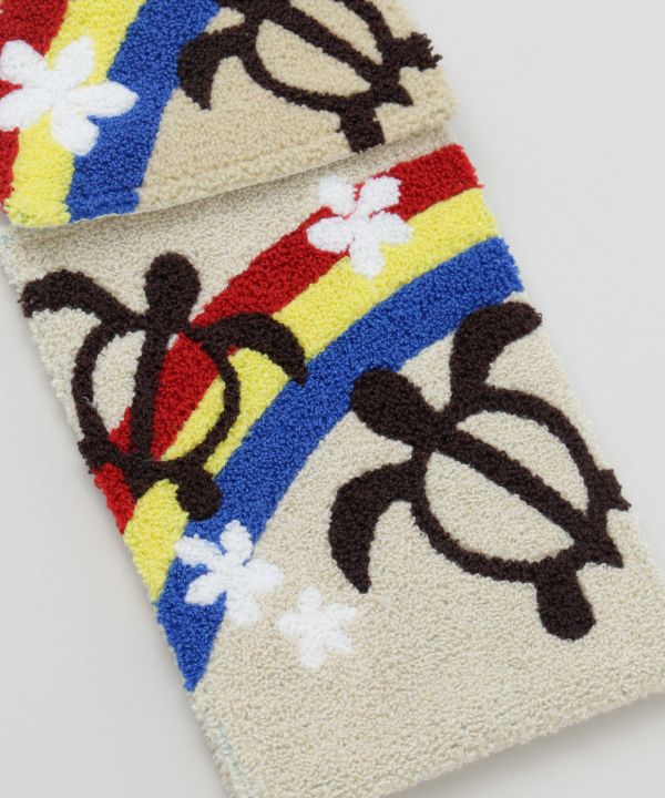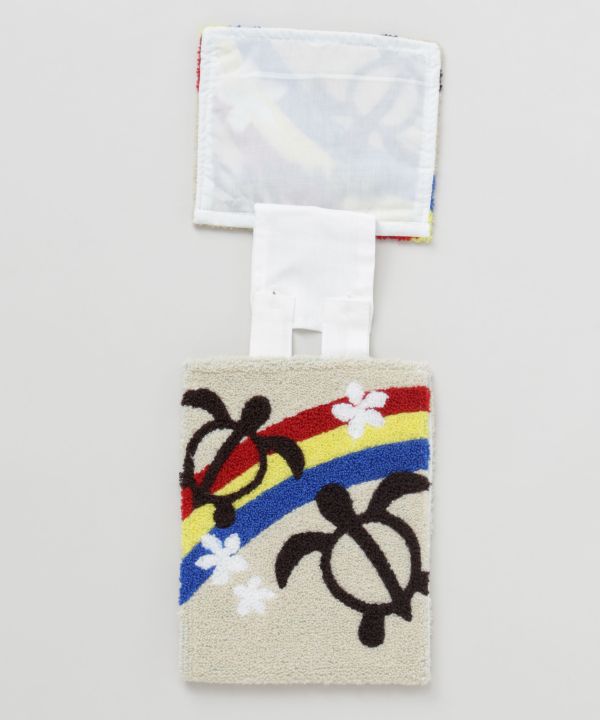 ハワイの守り神ホヌと明るい虹が描かれたロールペーパーホルダー。優しい色合いと立体的な刺しゅうが魅力です。トイレ空間を明るくしてくれるハワイアンデザイン。