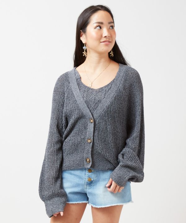 さらりとした風合いが魅力のニットキャミソールとカーディガンのセット。短め丈で袖にボリュームを持たせたカーディガンには、背中にラメ糸の刺しゅう入り。キャミソールは前中心の編み柄がポイントで、季節を問わず着回せるアイテムです。