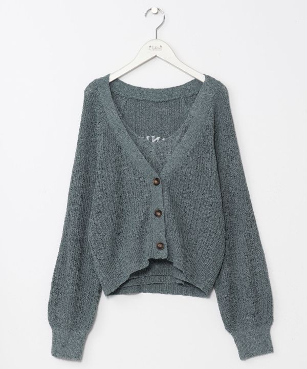 さらりとした風合いが魅力のニットキャミソールとカーディガンのセット。短め丈で袖にボリュームを持たせたカーディガンには、背中にラメ糸の刺しゅう入り。キャミソールは前中心の編み柄がポイントで、季節を問わず着回せるアイテムです。