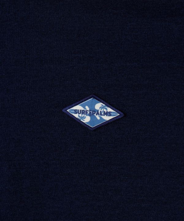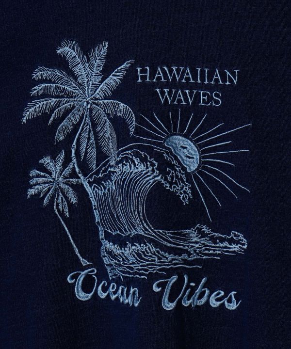 デニム風の洗い加工が施されたTシャツ。背中に施されたヤシの木と波の刺しゅうが印象的で、胸元のワッペンがアクセントになっています。程よくゆとりのあるシルエットで、カジュアルながらも抜け感のあるスタイルに。デニムやスカートと合わせてリゾート気分を楽しめる一枚です。製品洗いのため色合いに個体差があります。