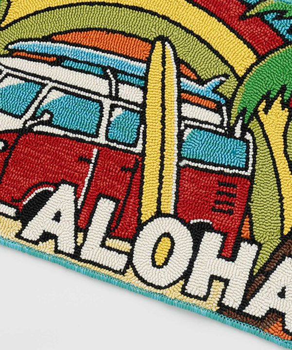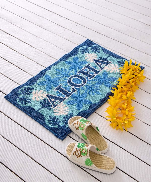 ハワイのモチーフが施された毛足のしっかりしたパイルマット。やや大きめサイズで玄関マットとしても活躍します。ふかふかの踏み心地と滑り止め付きで使いやすく、毎日の暮らしにハワイの明るい風を添えます。