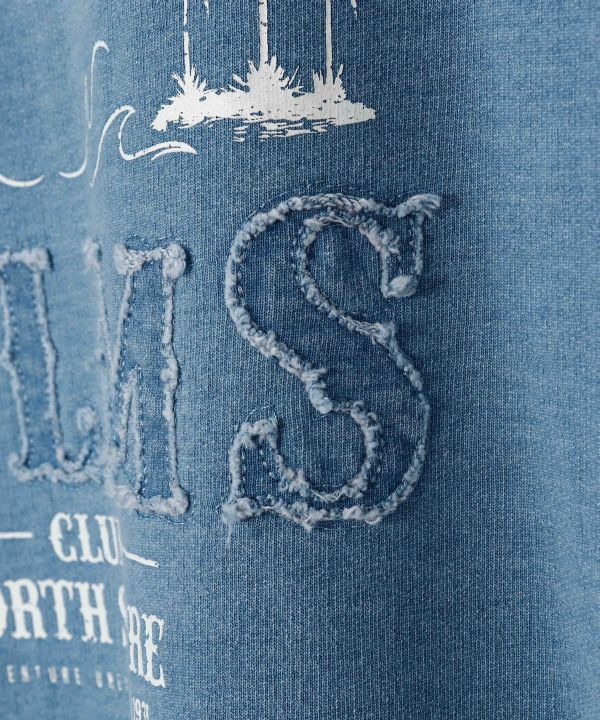 デニム風裏毛とデニムの切り替えデザインが印象的なメンズフード付きトップス。背中のパッチ刺しゅうとプリントがポイントになっています。ハーフパンツやパンツとのセットアップコーデで、統一感のあるカジュアルスタイルに。
