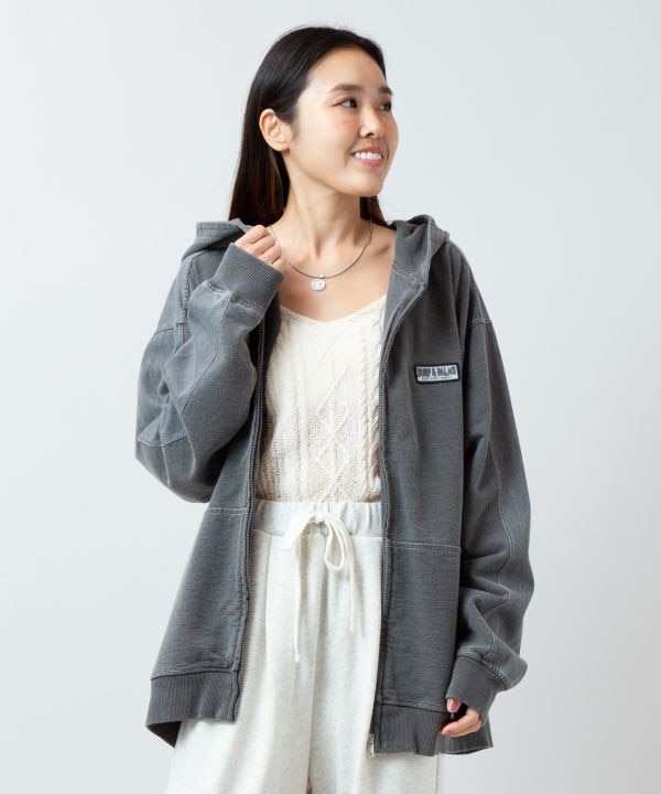 デニム風裏毛とデニムの切り替えデザインがスタイリッシュなメンズジップパーカー。背中のパッチ刺しゅうとプリントが存在感を演出。肌寒い時期の羽織りとしても活躍し、ハーフパンツやパンツとのセットアップコーデもおすすめです。