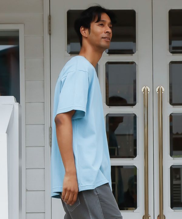 しっかりめのコットン素材を使用したメンズTシャツ。前後に施されたスプレープリントが印象的で、シンプルながら存在感のあるデザインです。ほどよい厚みで一枚でも着やすく、カジュアルスタイルにぴったり。
