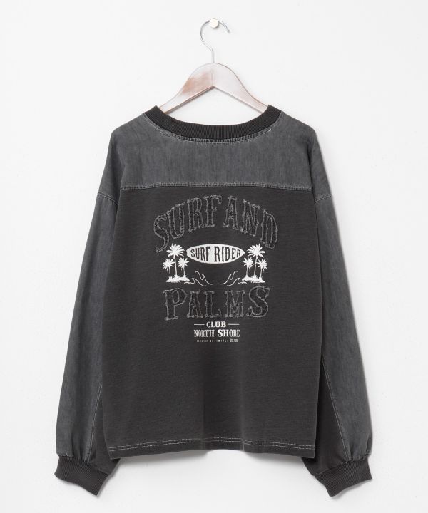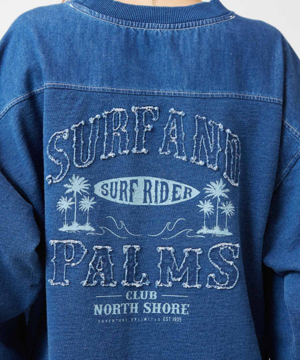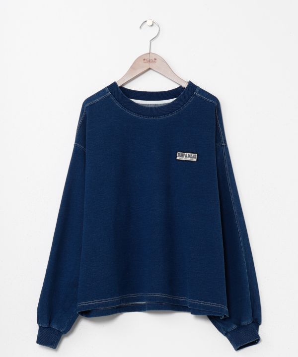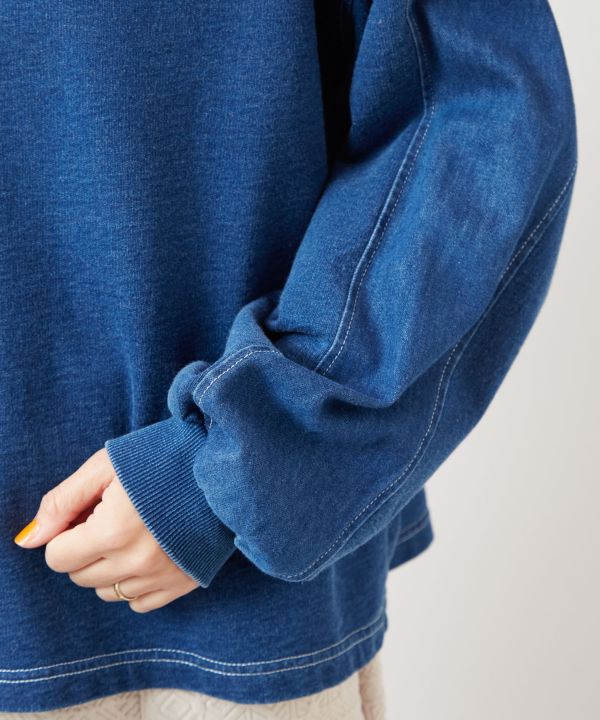 デニム風裏毛とデニムの切り替えデザインが目を惹くトップス。背中のパッチ刺しゅうとプリントがアクセントになっています。ふっくらとした袖が女性らしいシルエットを演出し、ハーフパンツやパンツとのセットアップコーデもおすすめです。