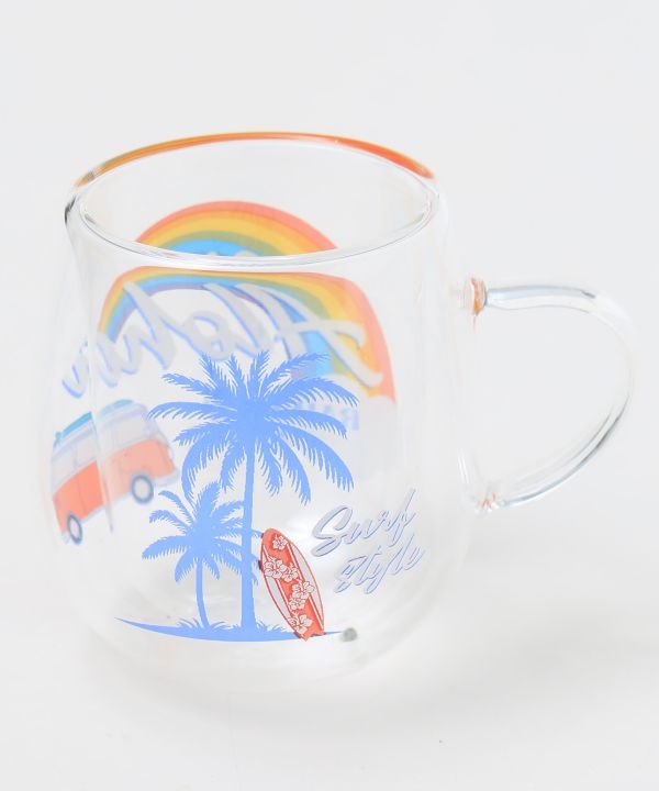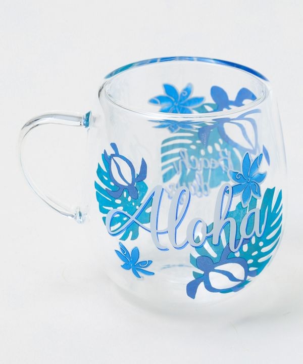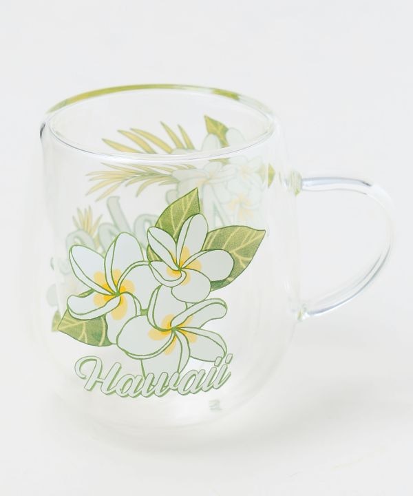 南国の花を描いたマハナエルアグラス。冷たい飲み物を入れても結露せず、温かい飲み物でも外側が熱くならない二重構造。ハワイの自然を感じるデザインで、リラックスタイムを彩ります。